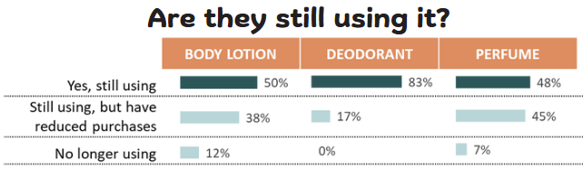 Majority of our sample are still using their previous personal care products. and for those who answer reduced/stop using it tend to stop purchasing Body lotion and reduced usage of perfume product. They who reduce purchasing perfume tend to cutting back on certain brands and only buying the main brand.