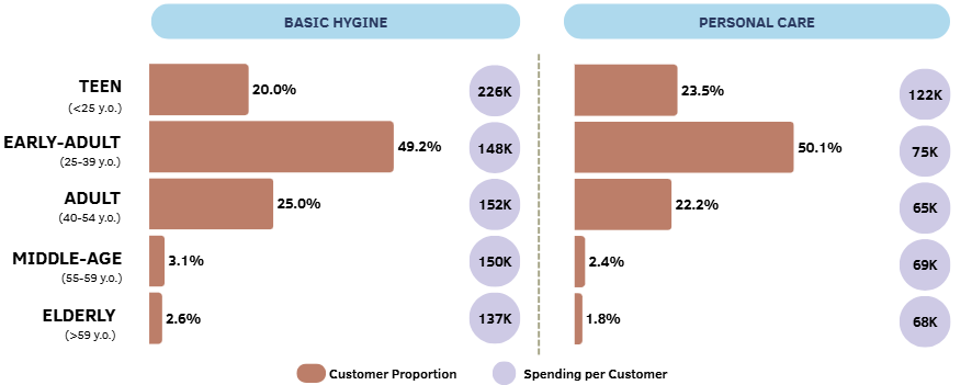 Personal care attracts relatively younger men, particularly teens, who spend almost twice as much as older age groups.