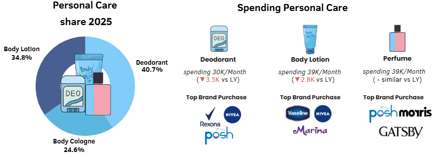 Deodorant stands out as the best-selling product among personal care items, with over 40% of total sales. However, consumers are starting to cut back on their spending, with an average drop of around IDR 3,500 per person compared to last year. A similar trend can be seen in body lotion, which also experienced a decrease of nearly IDR 3,000. On the other hand, consumer spending on perfumes has remained relatively stable.