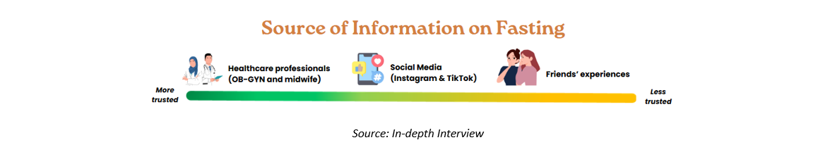 Healthcare professionals are the most trusted source, as their recommendations are based on pregnancy check-up results (OB-GYNs in urban areas and midwives in rural areas). Social media platforms such as Instagram and TikTok, along with friends’ experiences of fasting while pregnant, also help increase confidence in deciding whether to fast. Between these two sources, social media is generally considered more trustworthy than friends’ experiences.