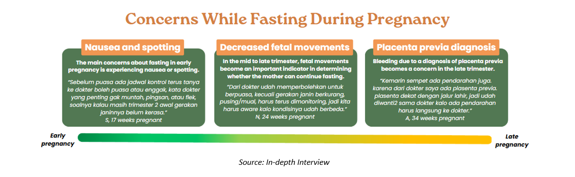 These concerns highlight that, while fasting may offer perceived benefits, pregnant women continue to monitor their physical condition and fetal well-being closely throughout pregnancy.