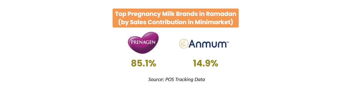 As illustrated in the figure, pregnancy milk can also be consumed during suhoor or iftar as an additional source of energy and nutrients. This highlights the role of pregnancy milk as a complementary nutritional source for pregnant women during fasting. Among pregnancy milk brands purchased by pregnant women in minimarkets, Prenagen records the highest sales contribution, followed by Anmum.