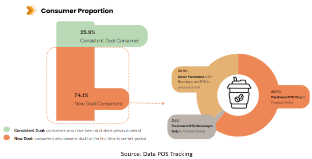 If we look closely at consumers who have already been dual consumers since the previous period regarding their purchase allocation, they started to increase their spending on MTO and reduce their spending on RTD compared with previous period. They think that MTO can be customized so that they can control their sugar and make it more healthier. Besides, freshers still become the main reasons why they decrease their spending on RTD and increase their spending on MTO.